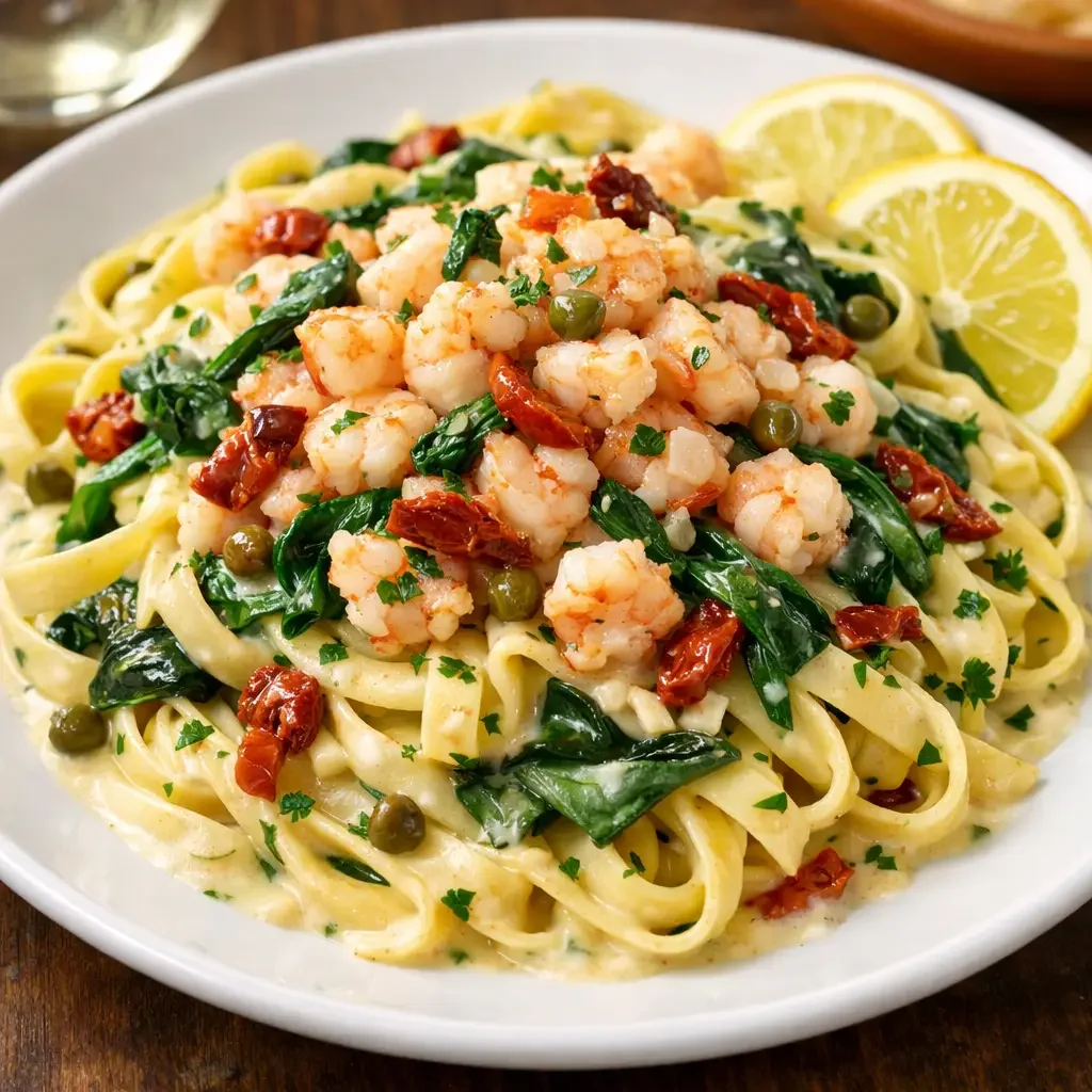 House-made Fettuccine served with Capers, Garlic, Spinach, Sun-dried Tomato, Chopped Shrimp, and Lemon White Sauce