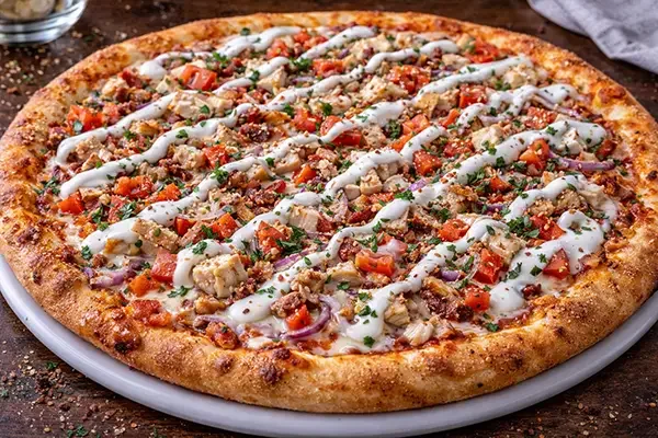Chicken, Bacon, Onions, Fresh Tomatoes, and Mozzarella Cheese topped with Ranch Dressing and Garlic