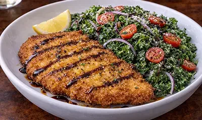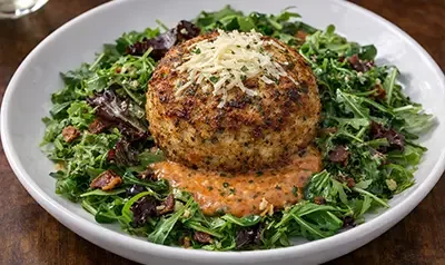 With House Greens, Red Pepper Remoulade, and Asiago Cheese
